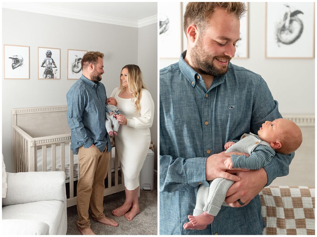 Fast forward a few weeks, and their baby boy, Hayden, arrived on September 23rd. This past week, I got to photograph their in-home lifestyle newborn session, and my heart was so full. Their home was cozy, full of love, and decorated with the cutest motocross-themed nursery (the perfect nod to something special they love).