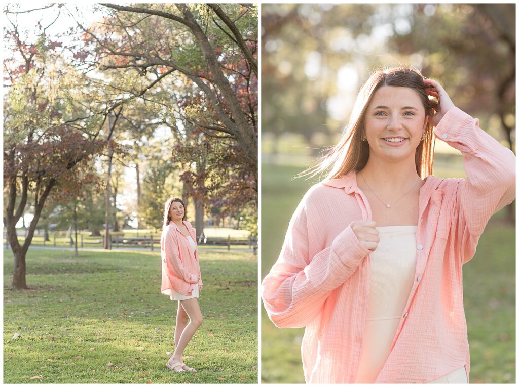 senior girl looking back over right shoulder wearing light pink shirt for this Longs Park Fall Senior Session