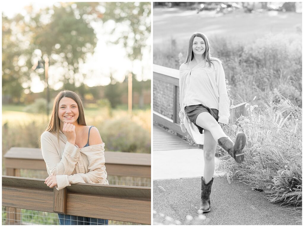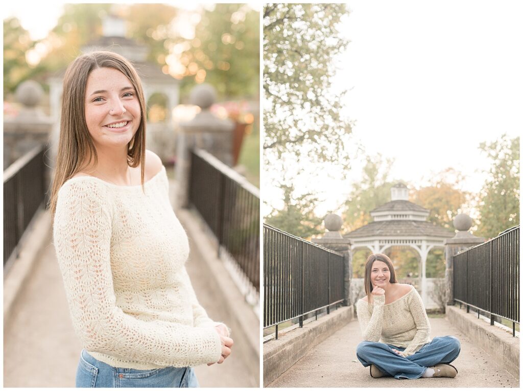 senior girl on bridge with left heel kicked up behind her for this Longs Park Fall Senior Session