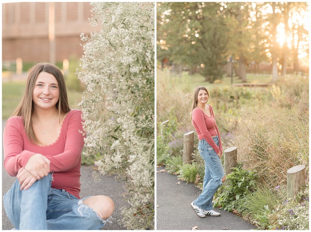 senior girl in pink shirt standing by white bush for this Longs Park Fall Senior Session