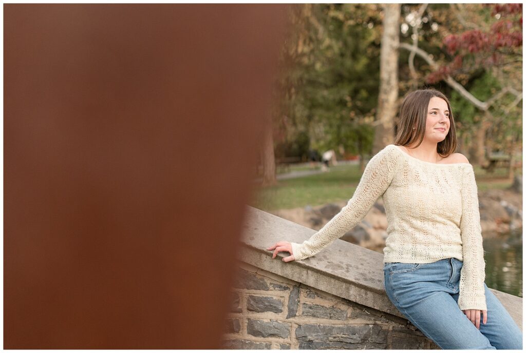 senior girl sitting against brick wall for this Longs Park Fall Senior Session in lancaster county pennsylvania