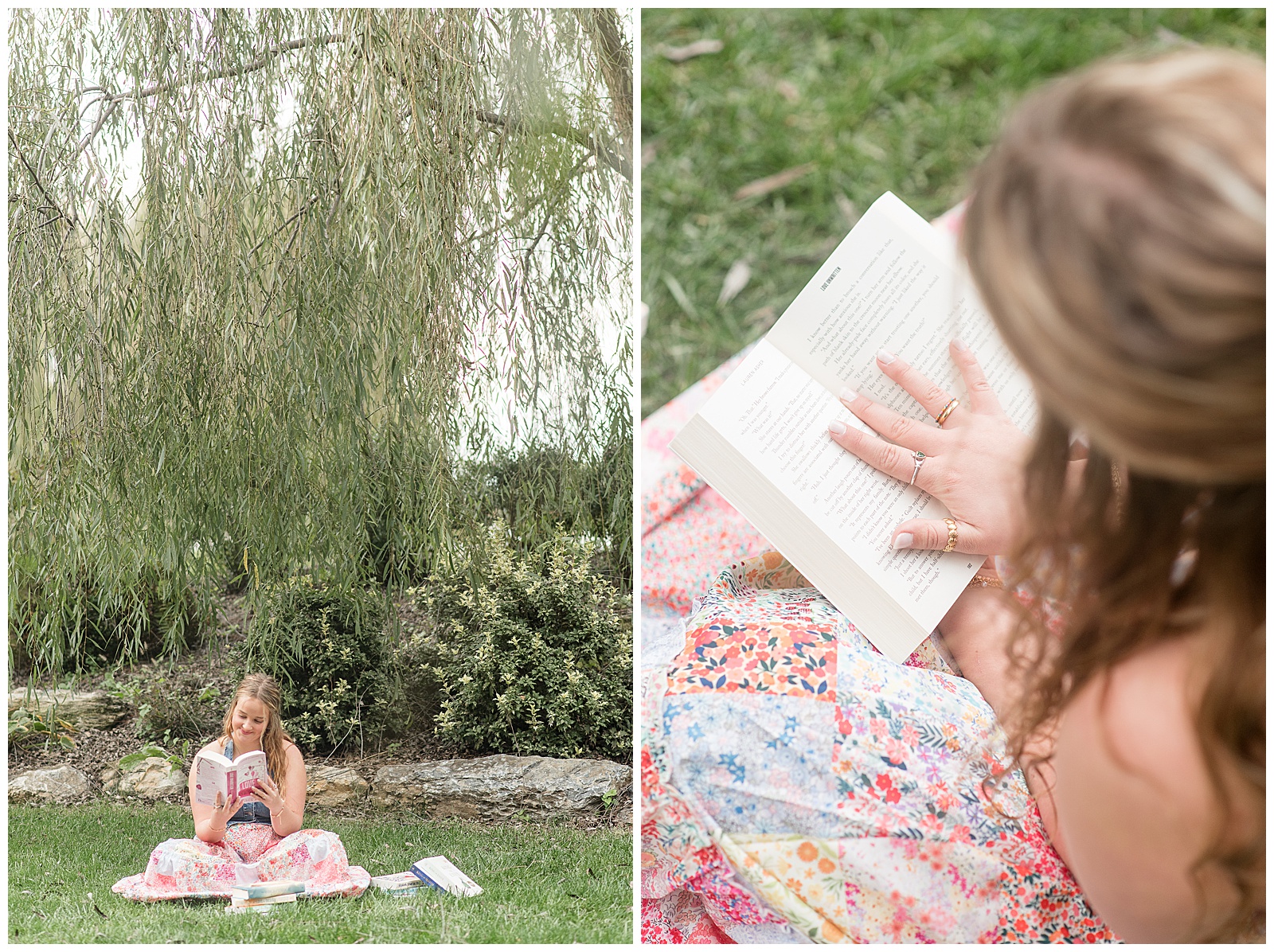 She started in a white dress and denim vest (and added her FFA jacket for a few special shots) and then changed into a colorful quilt-patterned skirt that was made for the willow tree we found on the property. She brought along some of her favorite books and sat down to read. Those moments might be some of my favorites of the night – peaceful, joyful, and so her.
