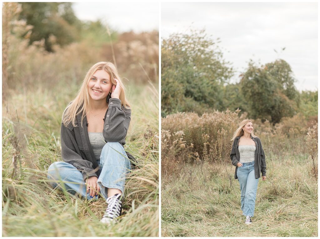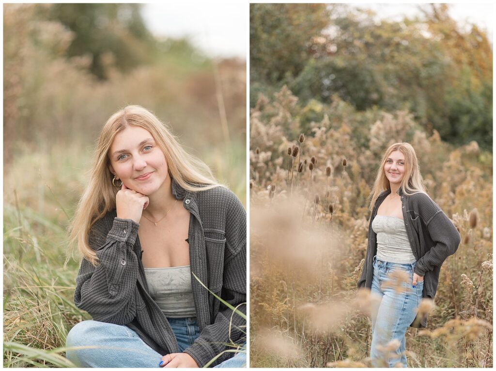 Tori changed into a cropped top, jeans, a gray button-up sweater, and black Converse for the second half of the session. The perfect cozy fall look! Her favorite location ended up being the pine tree grove. The tall evergreens surrounded her with texture and depth, and the way her eyes caught the light in that space was absolutely stunning. We finished the evening in a field of tall grasses, and even though it was chilly, she made it look effortless.