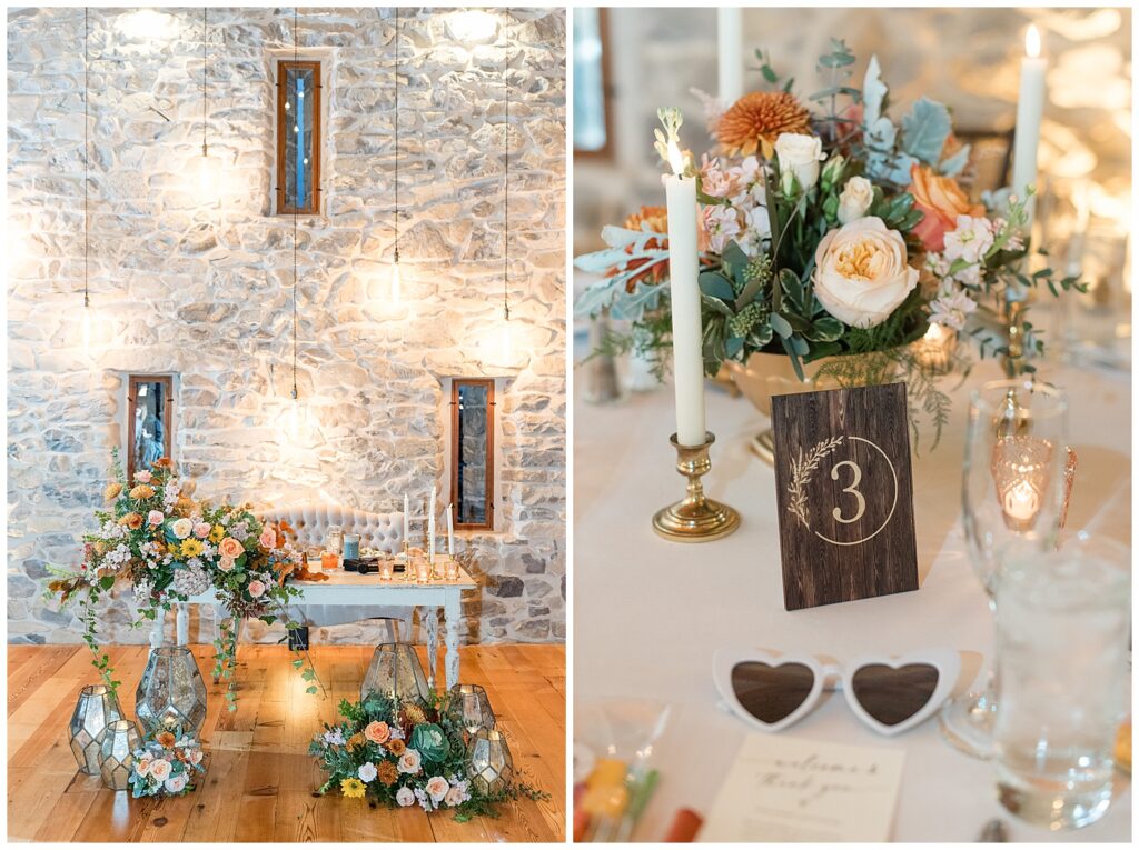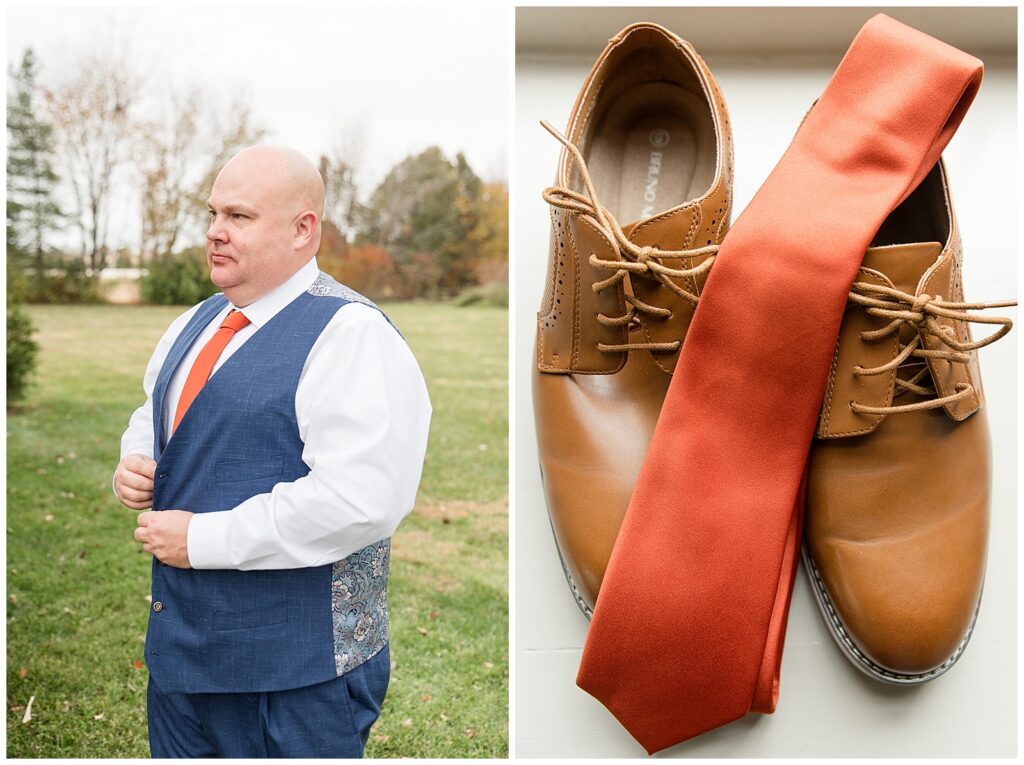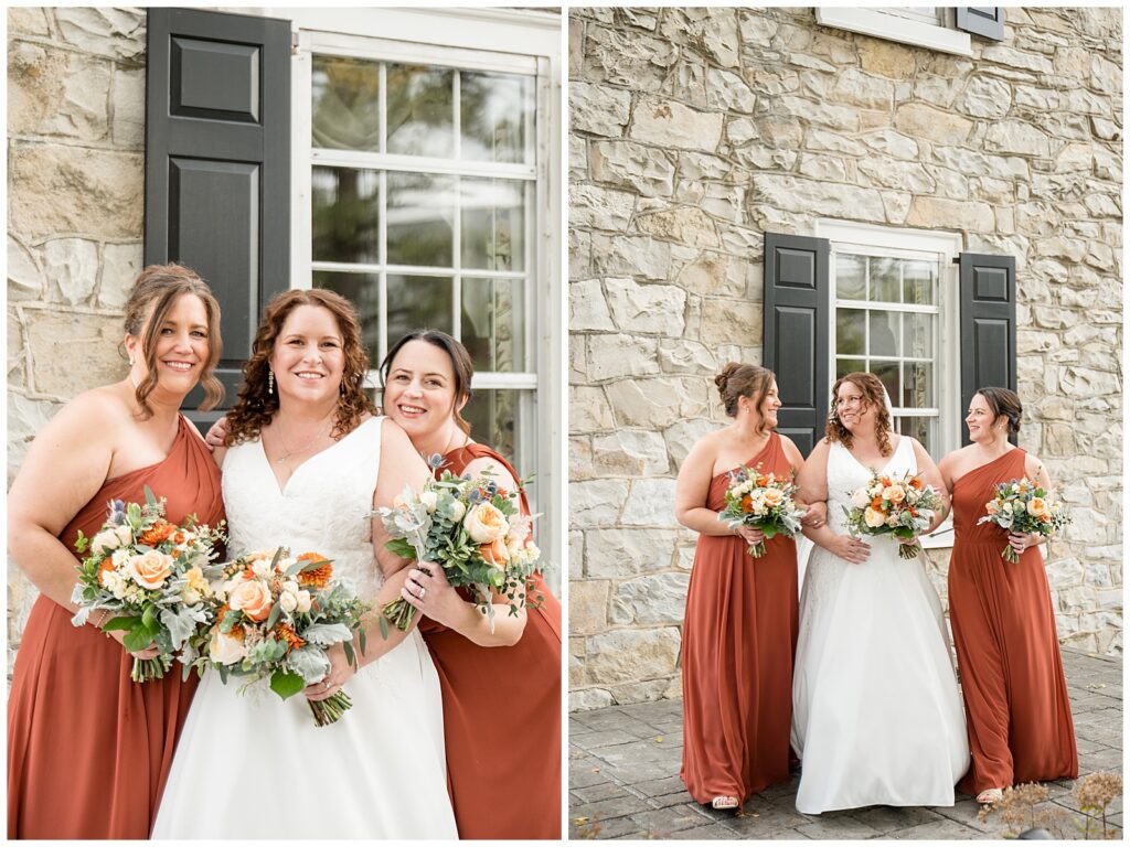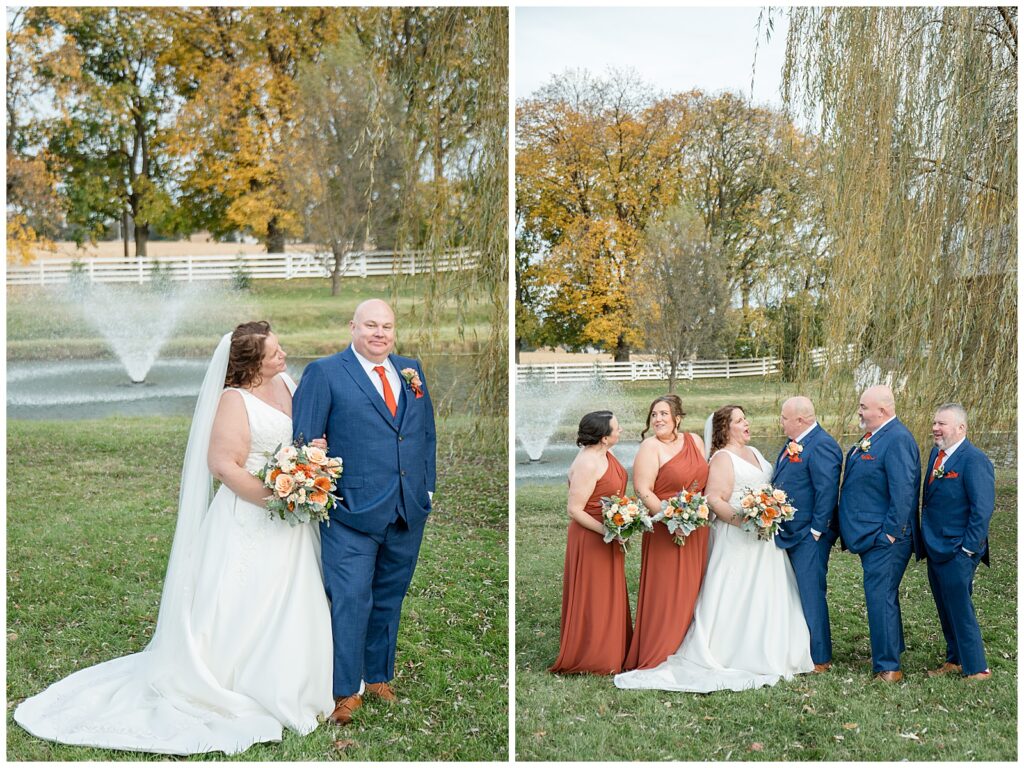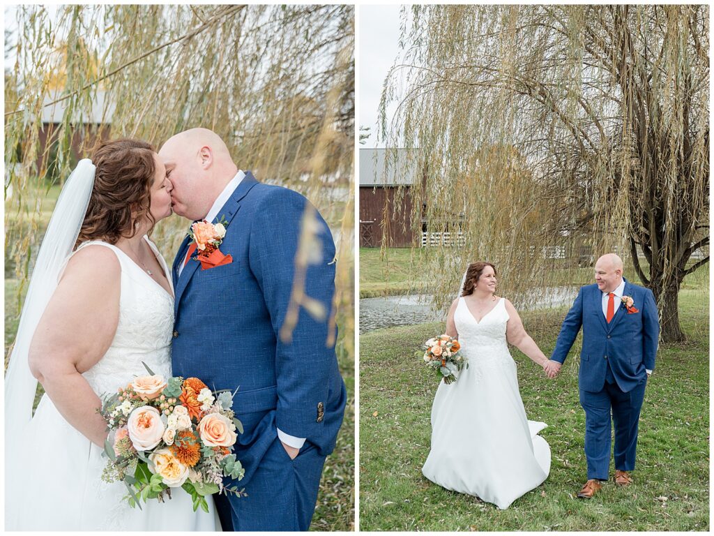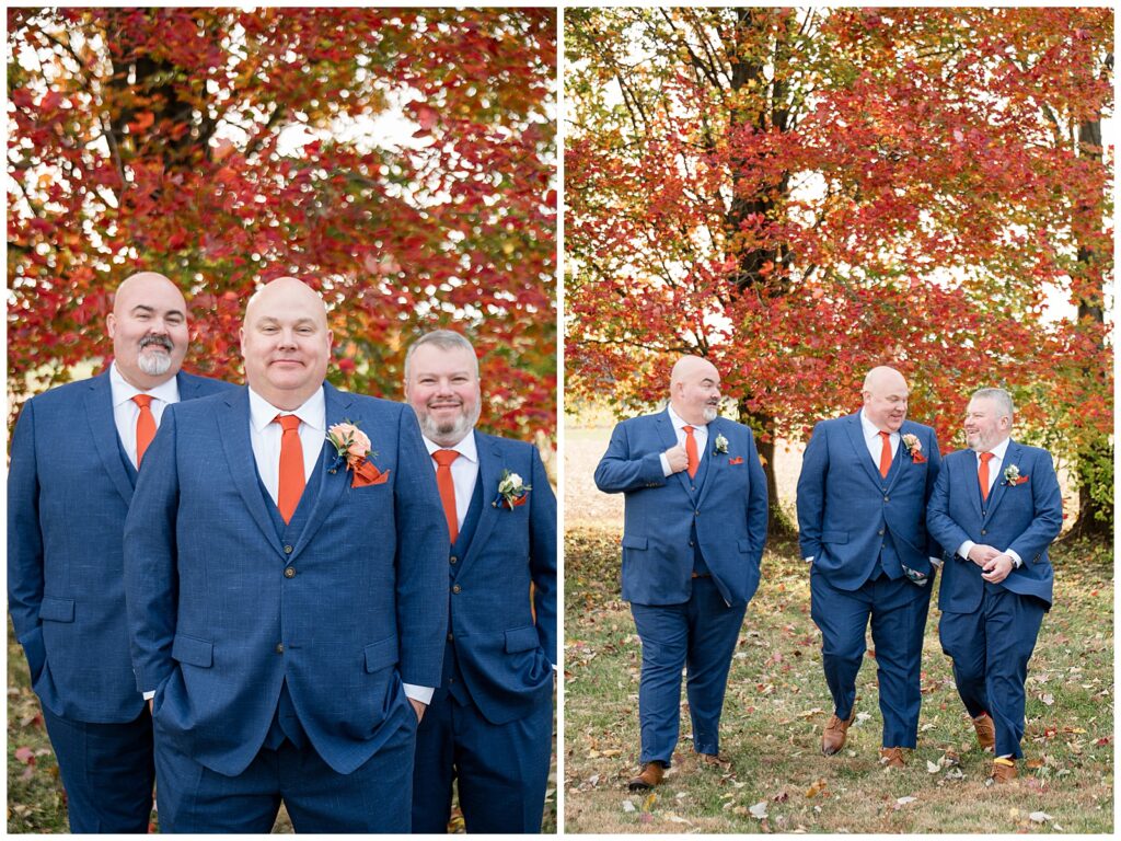 The color palette was perfect for fall. Bridesmaids in rich burnt orange dresses; the guys in sharp blue suits. Creating such a beautiful, timeless contrast against the barn’s warm tones.